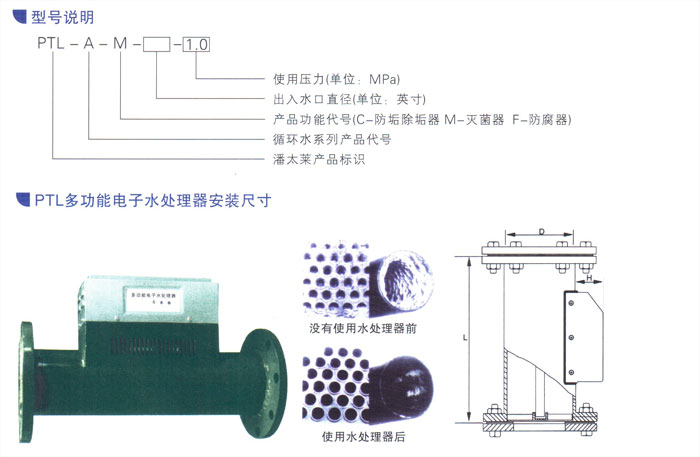 多功能水处理器是针对工业和民用水系统普遍存在的水沟、菌藻、腐蚀等问题而开发的高效水处理设备,操作简单,维护方便,使用寿命长;为便于用户安装使用,PTL多功能水处理器设计有:C型—除垢器、M型—灭菌器、F型—防腐器。