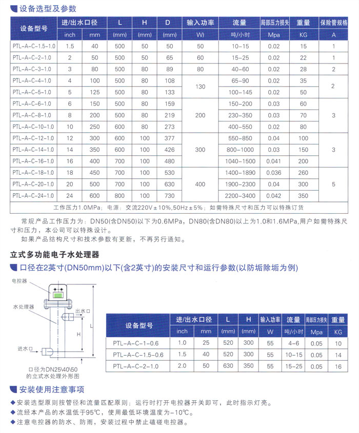 口径在2英寸(DN50mm)以下(含2英寸)的安装尺寸和运行参数(以防垢除垢为例)