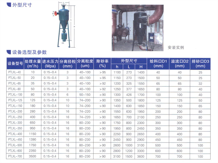 由于PTLXL系列除砂器的先进基本机理和结构,使其分割粒径(除污效率为50%时的粒径)为0.07毫米,当粒径为0.3毫米时,其除污率可达97%。并具有设备运行时即方便清污的有点。